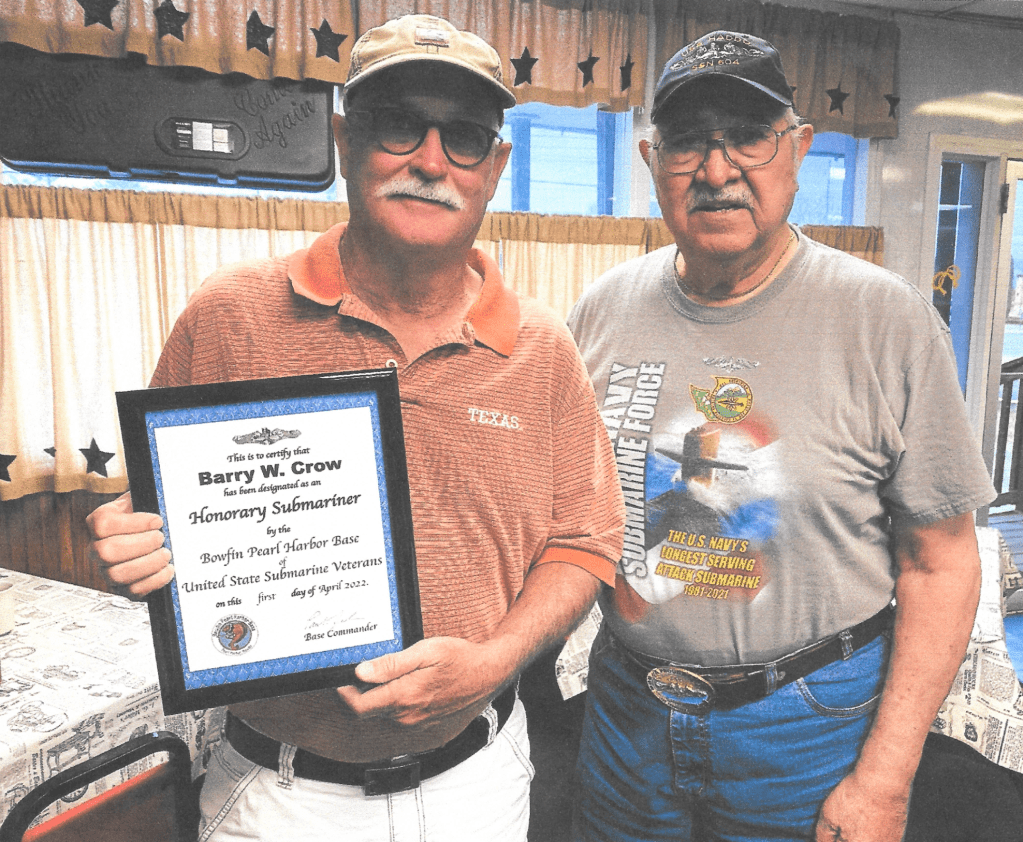 On April 1, 2022 Base Commander Paul Jurcsak issued an “Honorary Submariner” certificate to Barry “Crazy Ivan” Crow.