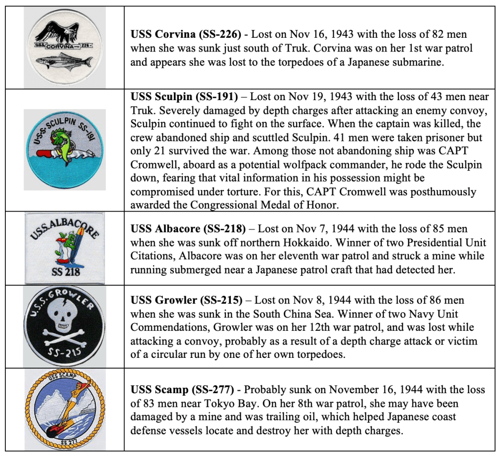 “For conspicuous gallantry and intrepidity at the risk of his life above and beyond the call of duty as Commander of a Submarine Coordinated Attack Group with Flag in the U.S.S. SCULPIN, during the Ninth War Patrol of that vessel in enemy-controlled waters off Truk Island, November 19, 1943. Undertaking this patrol prior to the launching of our first large-scale offensive in the Pacific, Captain Cromwell, alone of the entire Task Group, possessed secret intelligence information of our submarine strategy and tactics, scheduled Fleet movements and specific attack plans. Constantly vigilant and precise in carrying out his secret orders, he moved his underseas flotilla inexorably forward despite savage opposition and established a line of submarines to southeastward of the main Japanese stronghold at Truk. Cool and undaunted as the submarine, rocked and battered by Japanese depth-charges, sustained terrific battle damage and sank to an excessive depth, he authorized the SCULPIN to surface and engage the enemy in a gun-fight, thereby providing an opportunity for the crew to abandon ship. Determined to sacrifice himself rather than risk capture and subsequent danger of revealing plans under Japanese torture or use of drugs, he stoically remained aboard the mortally wounded vessel as she plunged to her death. Preserving the security of his mission at the cost of his own life, he had served his country as he had served the Navy, with deep integrity and an uncompromising devotion to duty. His great moral courage in the face of certain death adds new luster to the traditions of the United States Naval Service. He gallantly gave his life for his country.”