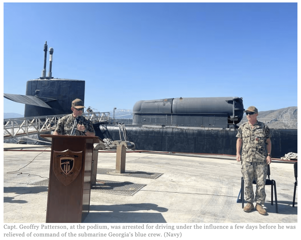 Four days before he was relieved as commanding officer of the submarine Georgia’s blue crew, Capt. Geoffry Patterson was arrested and charged with driving under the influence of alcohol on January 8 by sheriff’s deputies in the county where the submarine is based, according to civilian records.