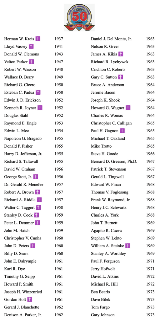 To perpetuate the memory of our shipmates who gave their lives while voluntarily serving in submarine warfare in the pursuit of their duties while serving their country. That their dedication, deeds and supreme sacrifice be a constant source of motivation toward greater accomplishments. To further promote and keep alive the spirit and unity that existed among submarine crewmen during World War II. To promote sociability general welfare and good fellowship among our members. To pledge loyalty and patriotism to the United States of America and it’s constitution.
