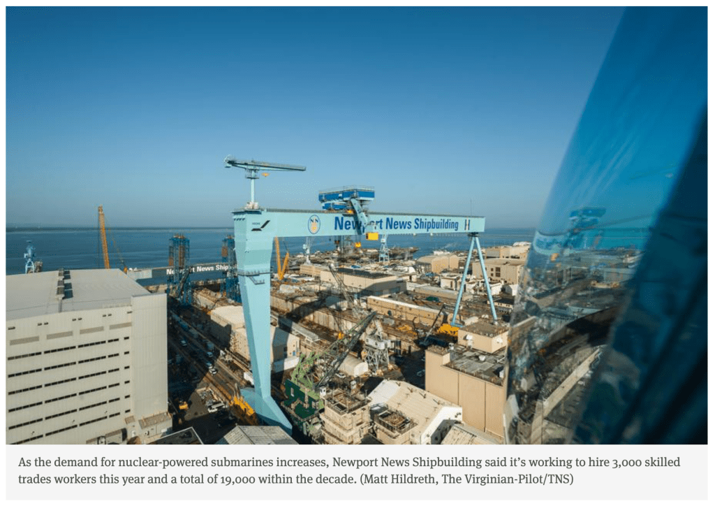 (Tribune News Service) — As the demand for nuclear-powered submarines increases, Newport News, Va., Shipbuilding said it’s working to hire 3,000 skilled trades workers this year and a total of 19,000 within the decade.