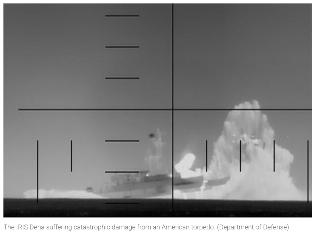 A United States Navy submarine sank an Iranian ship with a single torpedo as the frigate was transiting the Indian Ocean, marking the first such kill by a U.S. submarine since World War II.