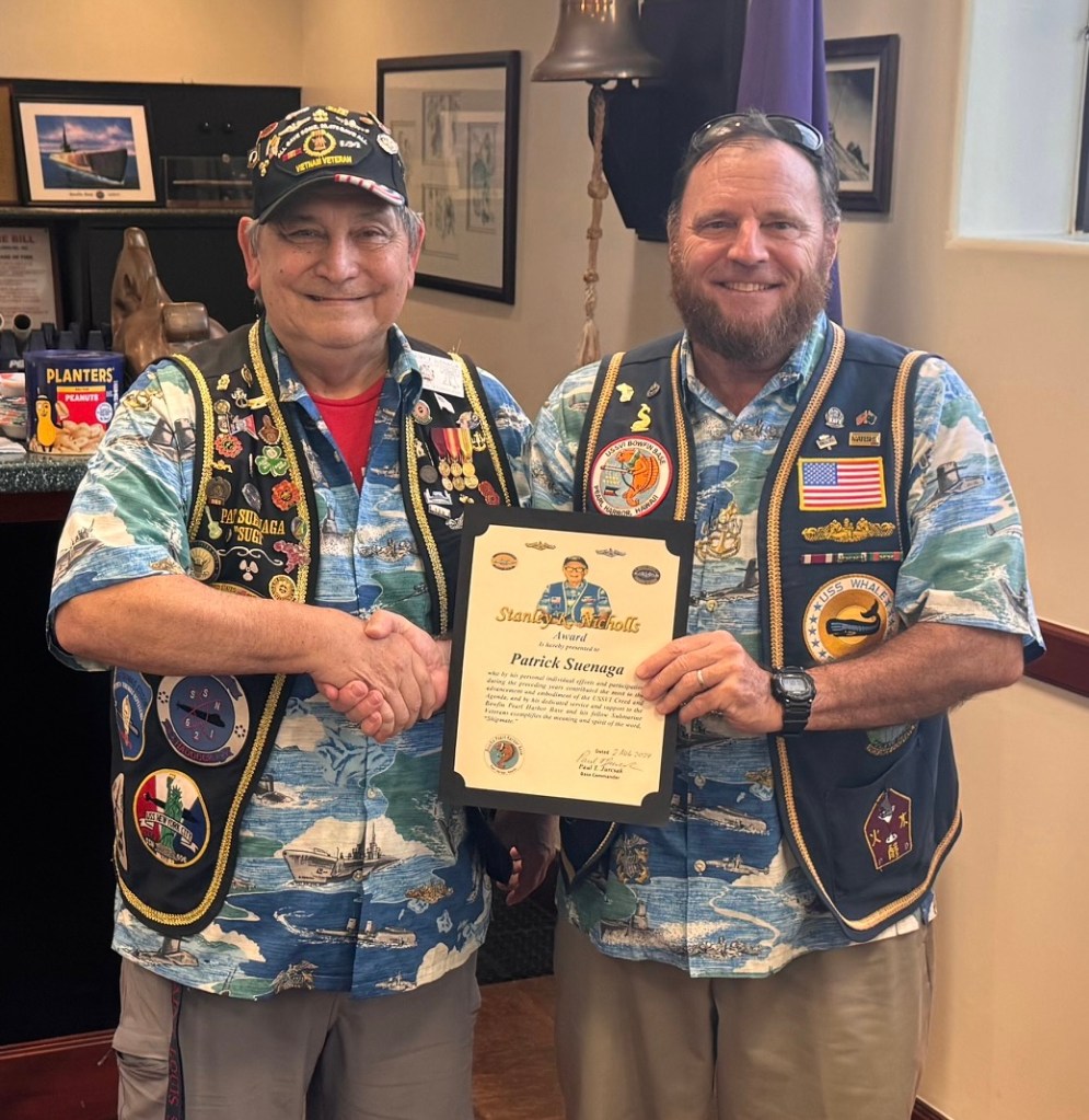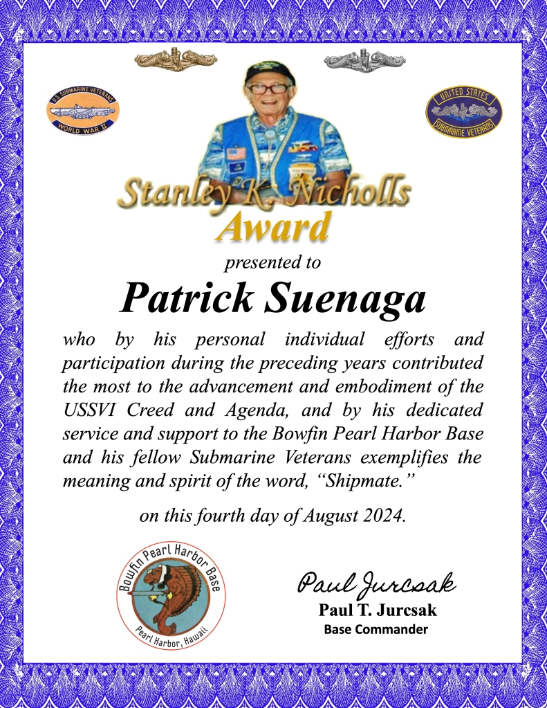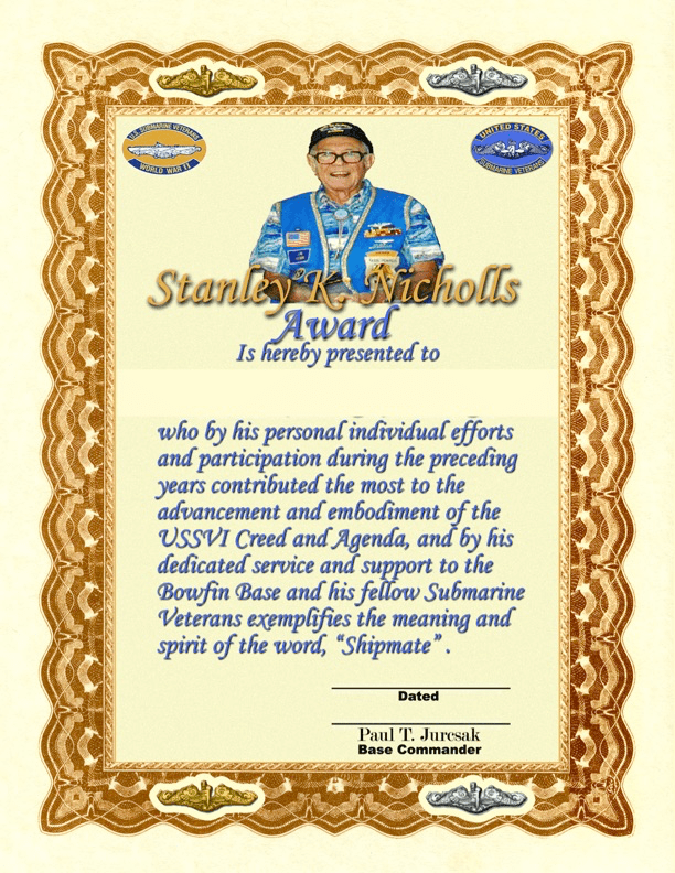 Established in 2011, the Stanley K. Nicholls Award is awarded to the Bowfin Pearl Harbor Base member who, by his personal individual efforts and participation during the preceding years contributed the most to the advancement and embodiment of the USSVI Creed and Agenda, and by his dedicated service and support to the Bowfin Pearl Harbor Base and his fellow Submarine Veterans exemplifies the meaning and spirit of the word, “Shipmate.”