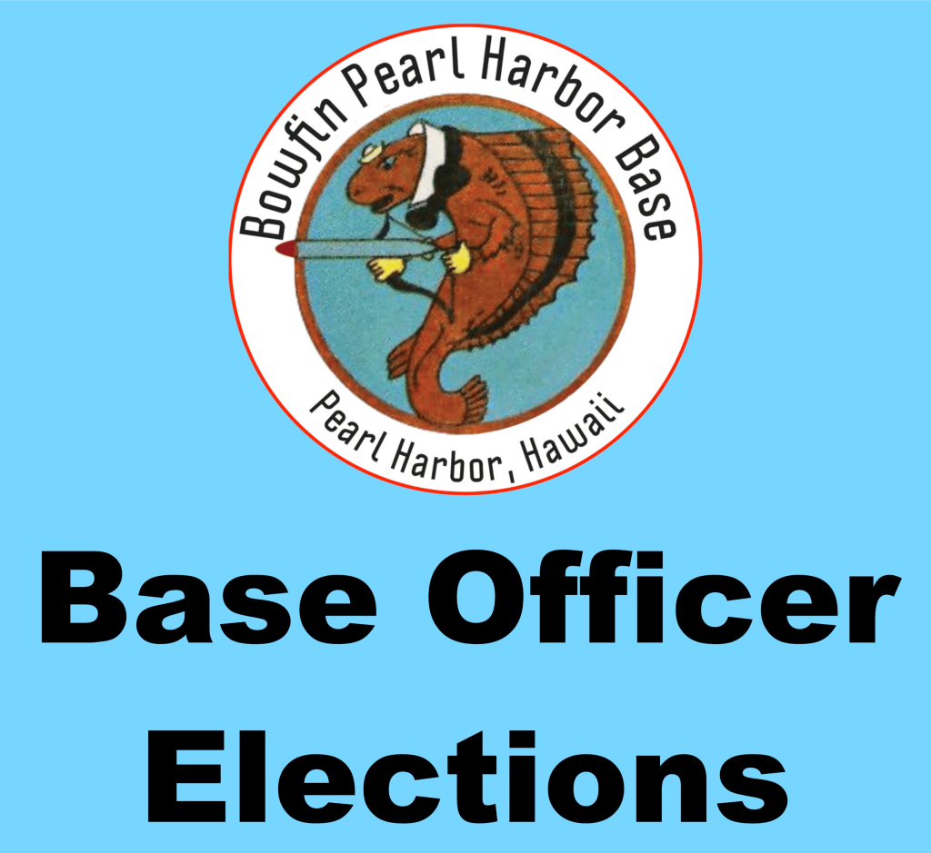 Nominations for Bowfin Pearl Harbor Base Officers is now open, and will close on August 5, 2022. Voting will be open from August 6 to 31, 2022. Results will be announced and newly elected officers will be sworn in at the September meeting. Officers to be elected are Base Commander, Vice Commander, Secretary and Treasurer.