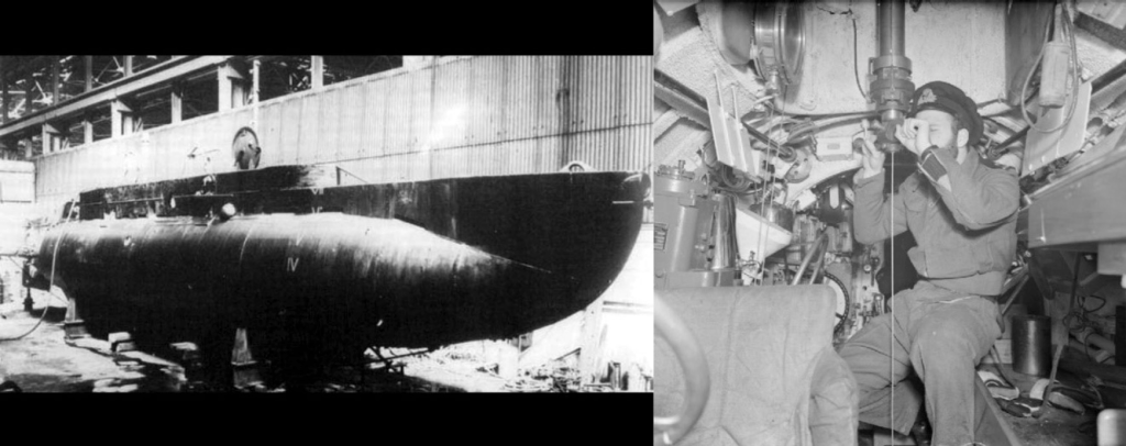 The submarine could carry a four-man crew and remain at sea for days. She could dive up to 300 feet. Due to her small size, the X-craft had only one access hatch and a small periscope that was mostly unreliable. Navigation was done through a Browns A Gyro Compass and Auto Helmsman. The X-craft could either be towed by a conventional submarine or launched from the deck of a submarine to reach its intended target. Two 3,570-lb mines were attached to its sides. A hand crank could release them when they were positioned below the hull of an enemy ship. The small crew consisted of one commanding officer, a first lieutenant, an engineer, and a diver.