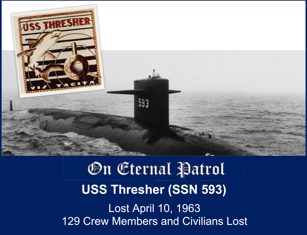 In company with SKYLARK (ASR 20), Thresher put to sea on 10 April 1963 for deep-diving exercises. In addition to her 16 officers and 96 enlisted men, the submarine carried 17 civilian technicians to observe her performance during the deep-diving tests.