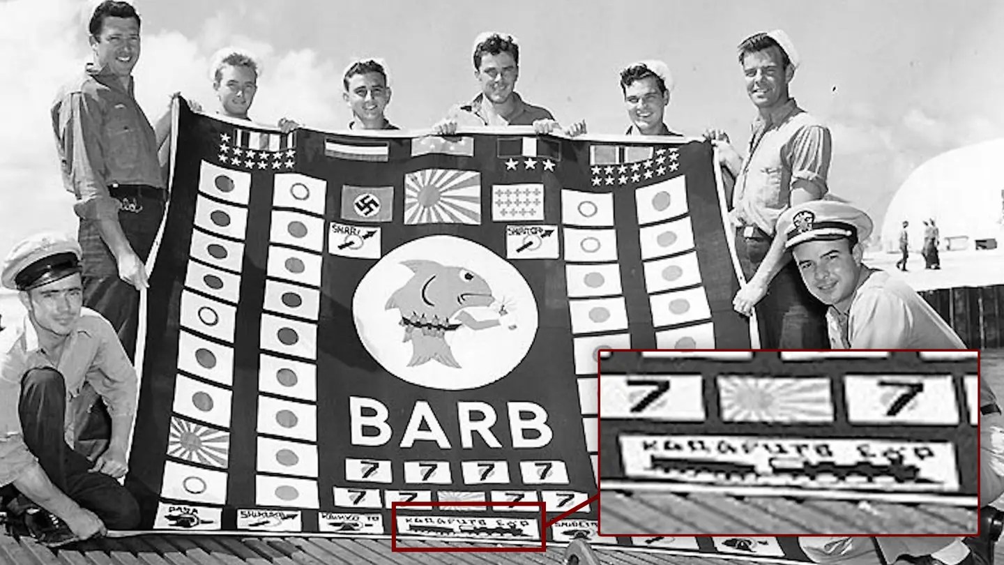 Members of the USS Barb’s crew hold the submarine’s battle flag aloft after returning from a final patrol in 1945. The train kill can be seen in the bottom-center of the flag. (U.S. Navy).