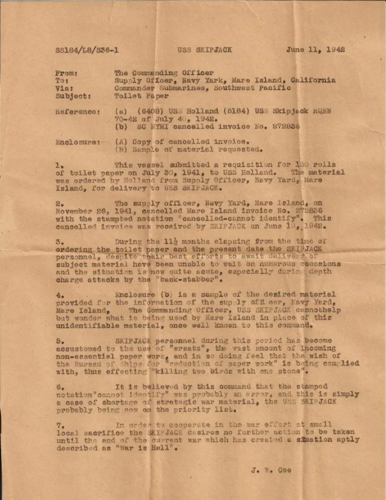 From: Commanding Officer To: Supply Officer, Navy Yard, Mare Island, California Via: Commander Submarines, Southwest Pacific Subject: Toilet Paper