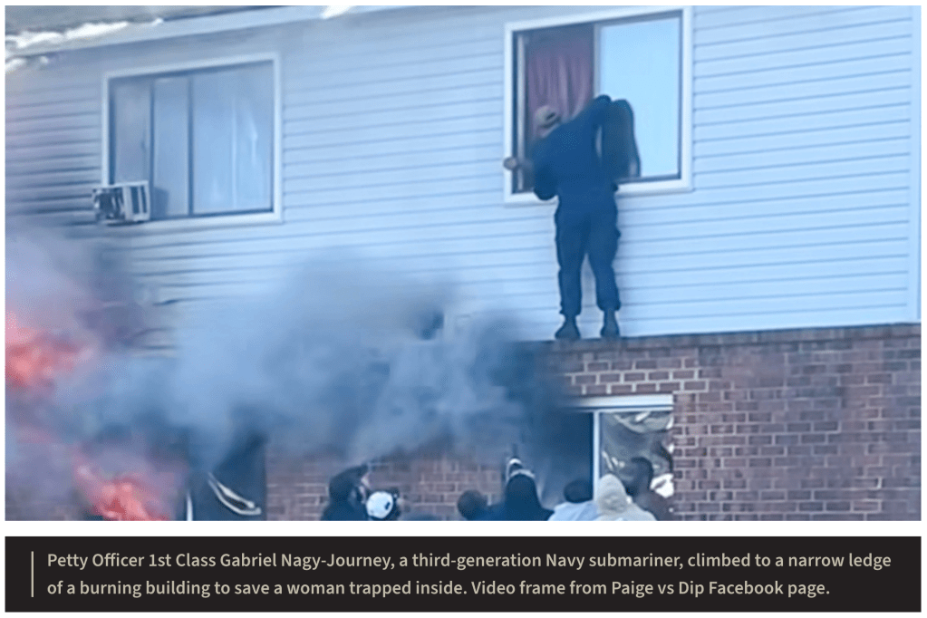 The video shows Petty Officer 1st Class Gabriel Journey, an Electronics Technician Nuclear, assigned to the USS Albany fast attack submarine in Norfolk, climbing to a narrow ledge on the exterior of an apartment as a woman calls for help from a window and as smoke and flames close in. Journey pulled the woman and her son from the flames, easing them into the arms of the crowd beneath.