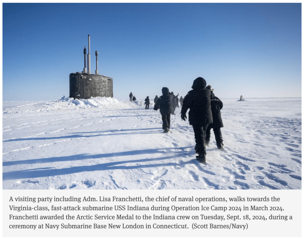 The crew of the USS Indiana, a Virginia-class, fast-attack submarine that spent three weeks in the seas near the North Pole during Operation Ice Camp 2024, were awarded the Navy’s Arctic Service Medal on Tuesday.