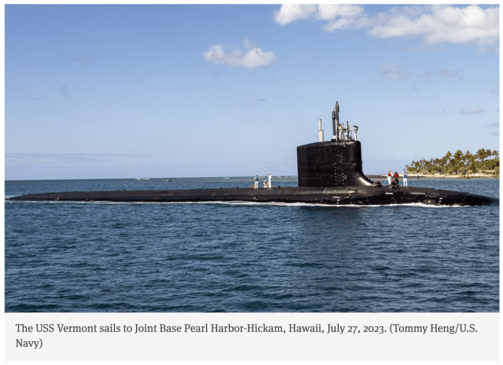 The USS Vermont’s visit to the city, about 200 miles south of Seoul, is a scheduled port visit, Submarine Group 7 spokesman Lt. Cmdr. Samuel Boyle said in an emailed statement Monday.